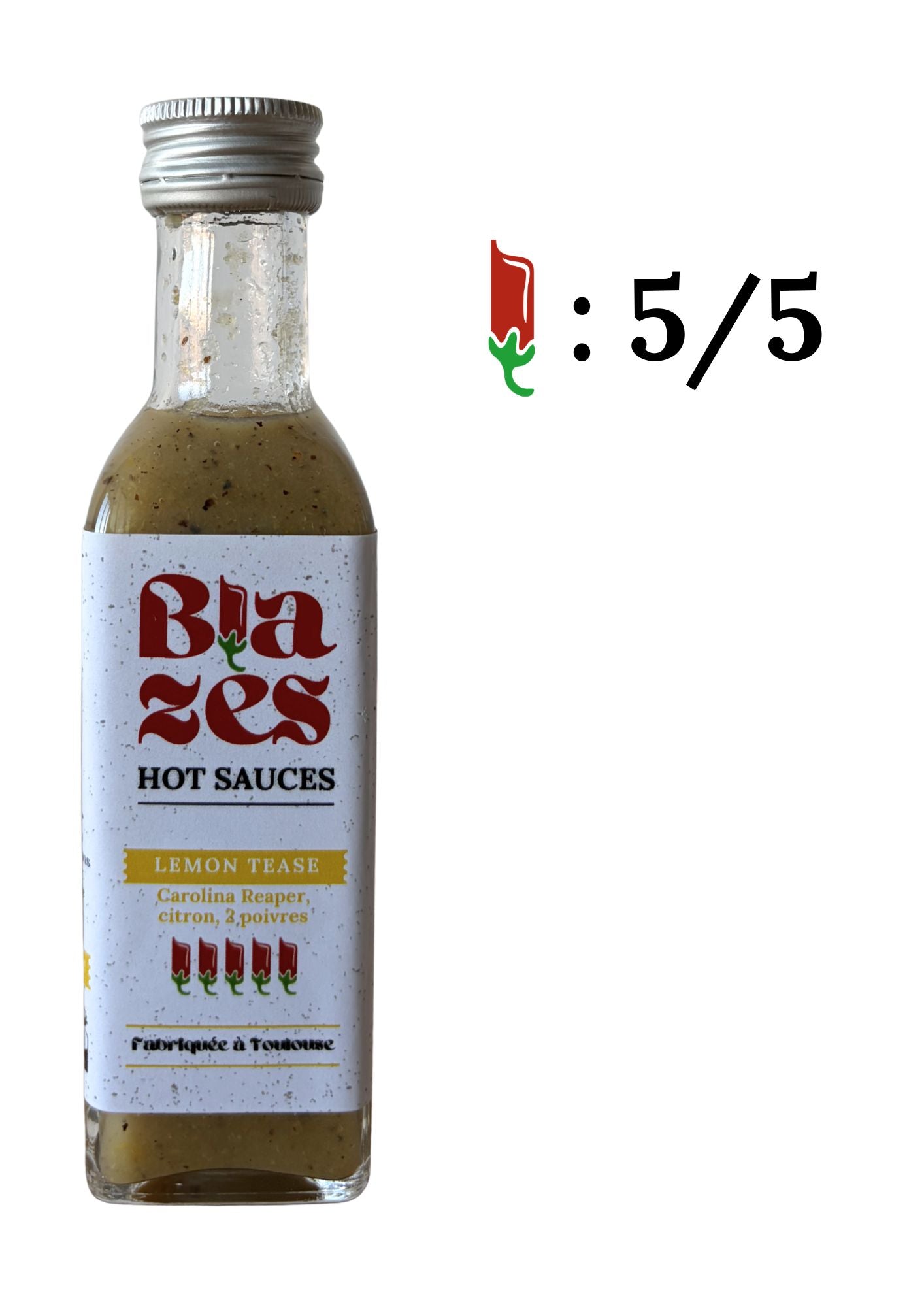 Ingrédients: Oignons, Jus de Citron, Citron (12,7%), Carolina Reaper, Vinaigre de Cidre, Ail, Habanero Jaune (1,2%), Poivre noir (1,2%), Sel, Sichuan (0,3%).